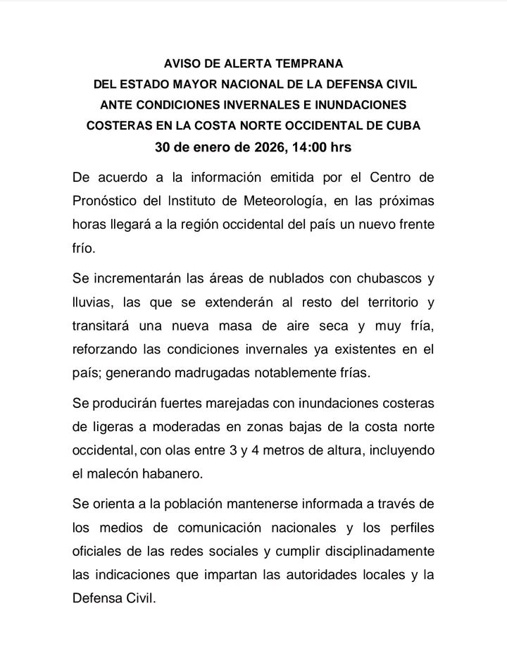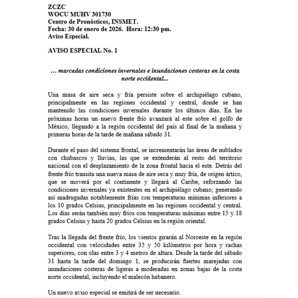 •El Instituto de Meteorología de Cuba ha emitido un Aviso Especial y la Defensa Civil una nota de Alerta Temprana por condiciones invernales e inundaciones costeras.