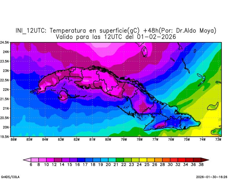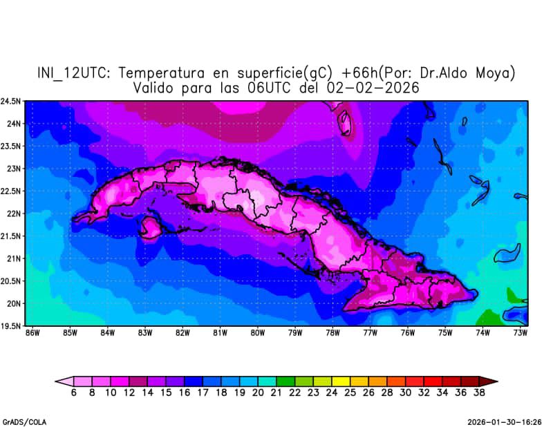 •Para la madrugada y amanecer del domingo 1 de febrero se pronostican temperaturas mínimas entre 10-13 °C en la mitad occidental del país o sea desde Pinar del Río hasta Sancti Spíritus y la posibilidad de que se reporten valores notablemente fríos por debajo de los 10 °C. En el resto del país se prevén mínimas entre 15-18 °C, superiores en zonas costeras e inferiores en el interior. Estos pronósticos son basados en la salida del modelo WRF de alta resolución del Dr Aldo Moya.