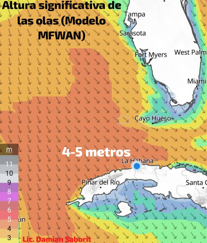 •Tras el tránsito del frente frío sobre la mitad occidental del archipiélago mañana sábado 31 de enero; se impondrá un régimen de vientos de componente noroeste, con velocidades entre 35 y 50 km/h, con rachas superiores. Esta situación estará generando fuertes marejadas en la costa norte occidental, con altura de olas significativas entre 4 y 5 metros, entre la noche del sábado y las primeras horas del domingo, con peligro para la navegación. Además, existe la posibilidad de ocurrencia de inundaciones costeras moderadas en zonas bajas de dicho litoral, por mar mixta del noroeste, las que pueden llegar a ser localmente fuertes en zonas bajas, principalmente en el Malecón Habanero. Cabe destacar, que durante la noche del sábado tendremos la presencia de una luna con 98% de iluminación, pudiendo generar una marea de sizigia adicional. (Lic. Damián Saborit).