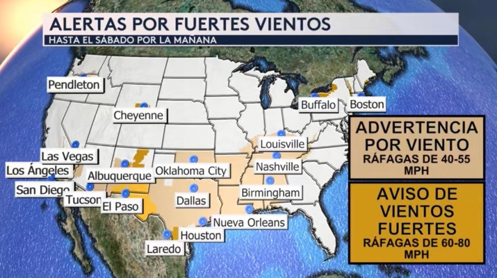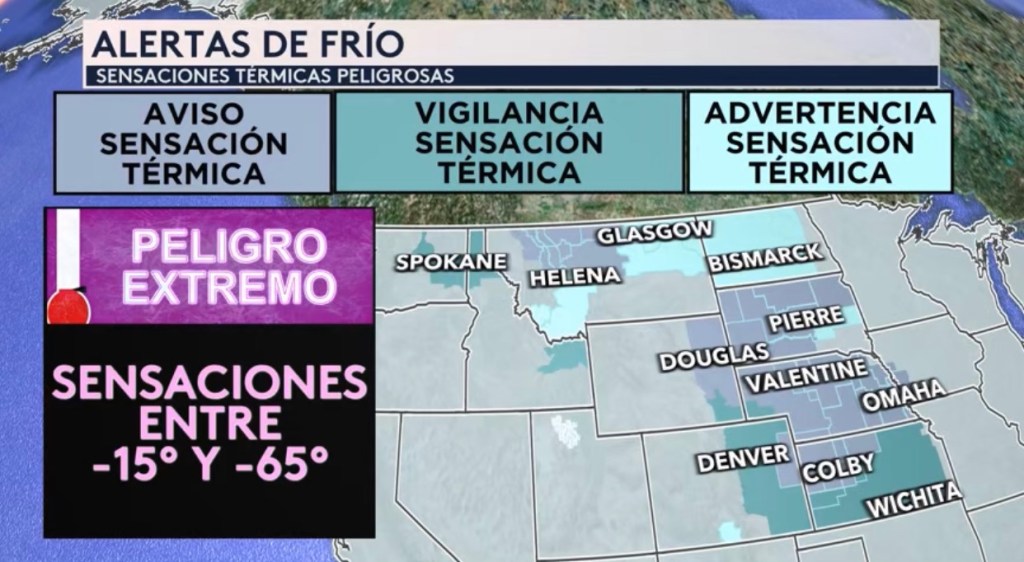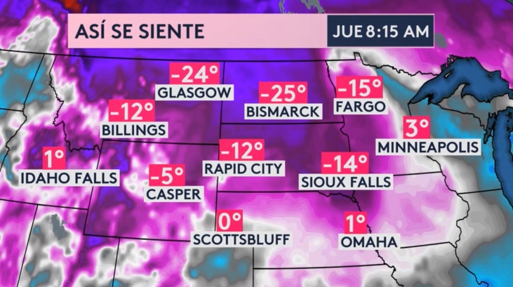 •Este frío se desplazará hacia el sur durante los próximas días, trayendo sensaciones térmicas bajo cero hasta Arizona y valores de un solo dígito tan al sur como hasta Oklahoma