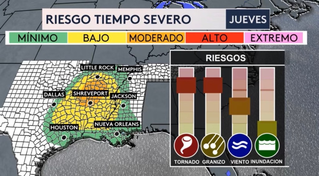 •Riesgo de tiempo severo esta noche desde Texas hasta Mississippi con tornados (algunos fuertes), granizo de gran tamaño y vientos dañinos siendo las amenazas principales