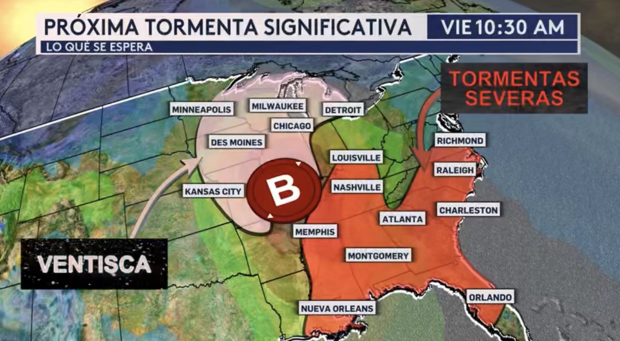 •Vigilando nuestra próxima tormenta invernal, que traerá tiempo severo esta noche para el sur; nevadas intensas, fuertes vientos para el Medio Oeste y tiempo severo para el sureste mañana; lluvia y nevadas para el este y noreste el sábado