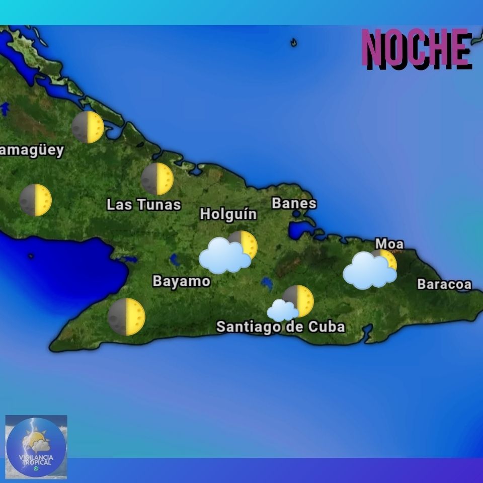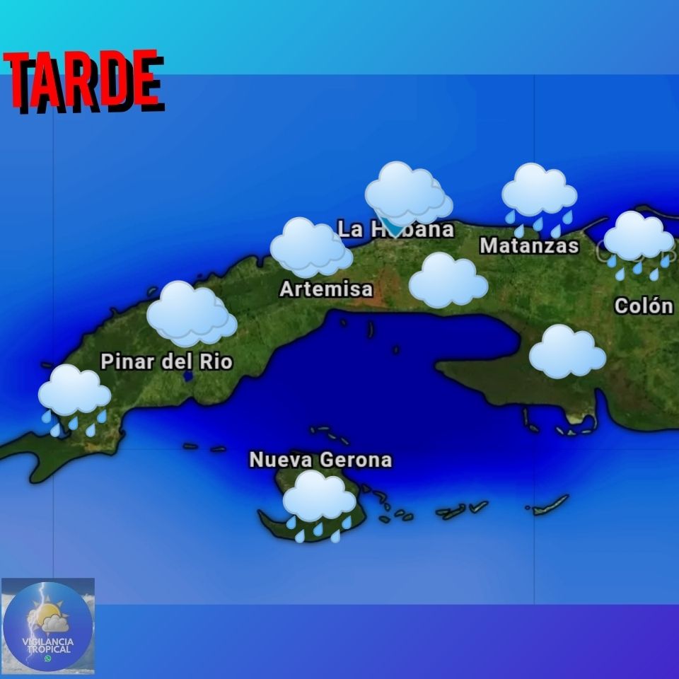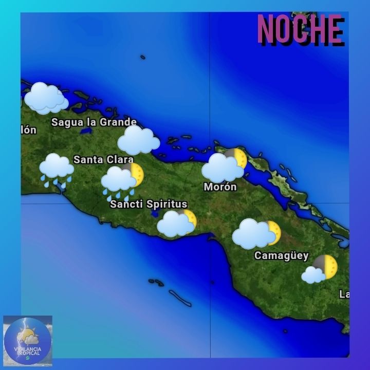 Estará nublado en el occidente con algunos chubascos y lluvias, que disminuirán desde el final de la mañana. En la región central estará parcialmente nublado y con poca nubosidad en el oriente, en la tarde estará parcialmente nublado en ambas regiones, llegando a nublarse en zonas del sur del centro con aislados chubascos y lluvias, que resultarán más escasos en la región oriental.