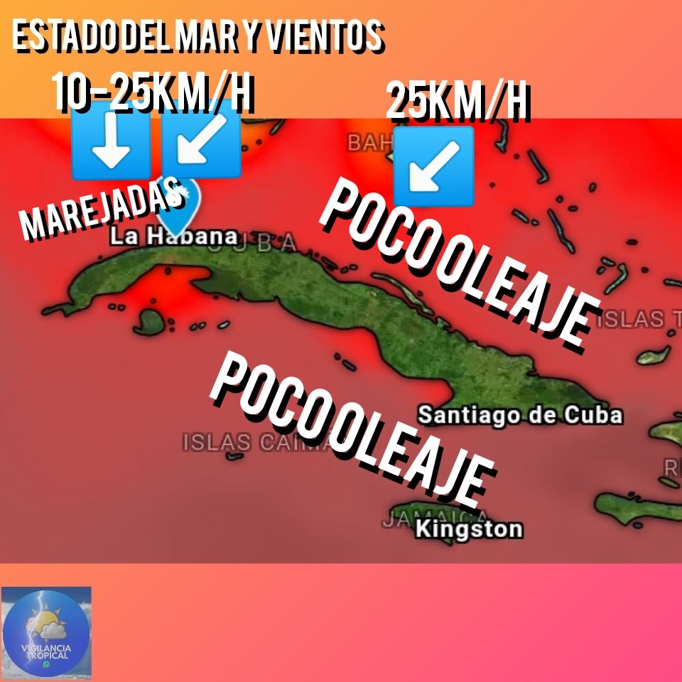 Soplarán vientos del norte al nordeste en occidente entre 10 y 25 kilómetros por hora. En el resto del país serán variables y débiles, desde la tarde serán de región nordeste en el centro, hasta 25 kilómetros por hora. Habrá poco oleaje en todos los litorales, excepto en el norte central que habrá mar tranquila, incrementándose desde la tarde a poco oleaje. En la costa norte occidental se incrementará a oleaje desde el final de la mañana y llegará a marejadas en la tarde en el litoral de Pinar del Río y Artemisa.