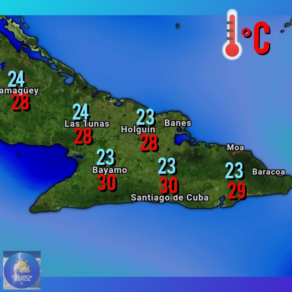 Las temperaturas máximas estarán entre 26 y 29 grados Celsius superiores en el sur oriental. En la noche las temperaturas estarán entre 21 y 24 grados Celsius.