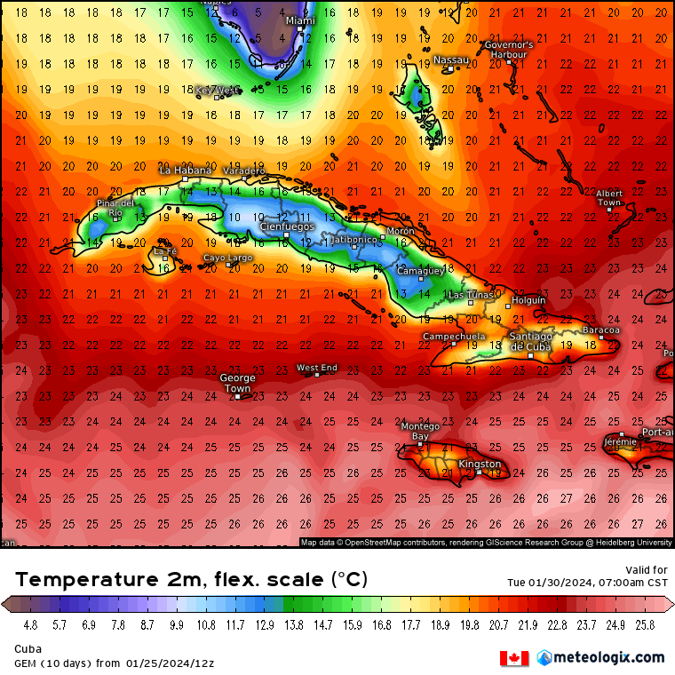 • Pronóstico de temperatura mínima para Cuba / válido para el martes 30 de enero 7:00am (hora local).