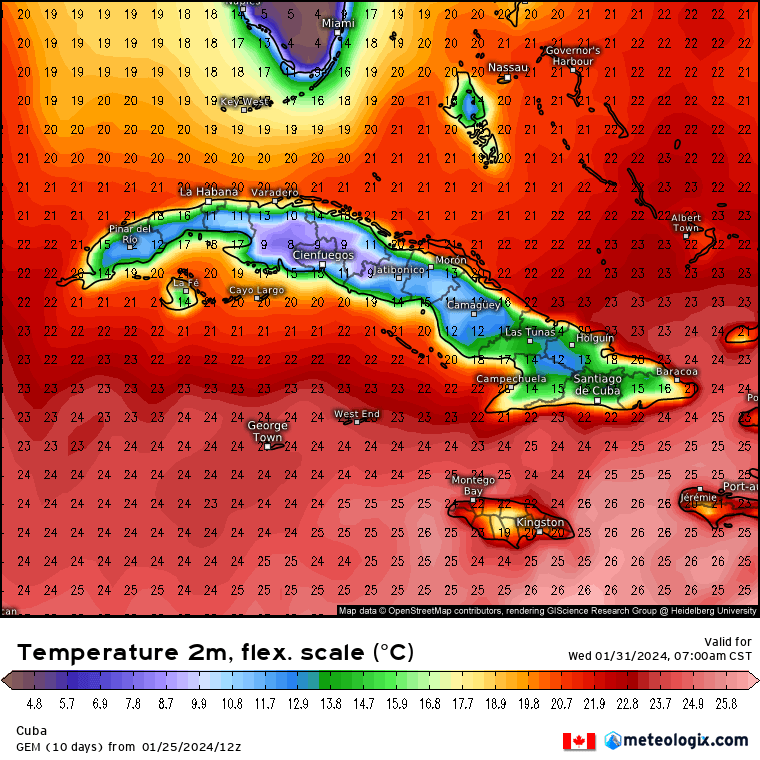 • Pronóstico de temperatura mínima para Cuba / válido para el miércoles 31 de enero 7:00am (hora local).