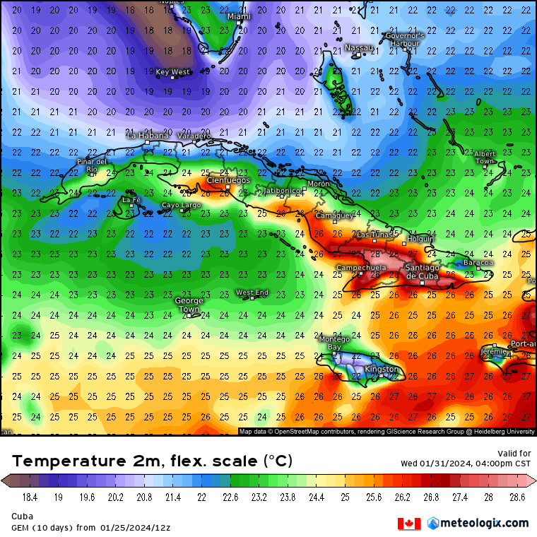 • Pronóstico de temperatura máxima para Cuba / válido para el miércoles 31 de enero 4:00pm (hora local).