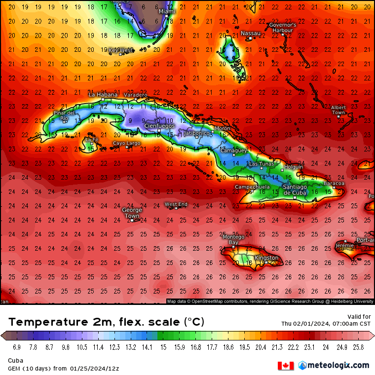 • Pronóstico de temperatura mínima para Cuba / válido para el jueves 1 de febrero 7:00am (hora local).