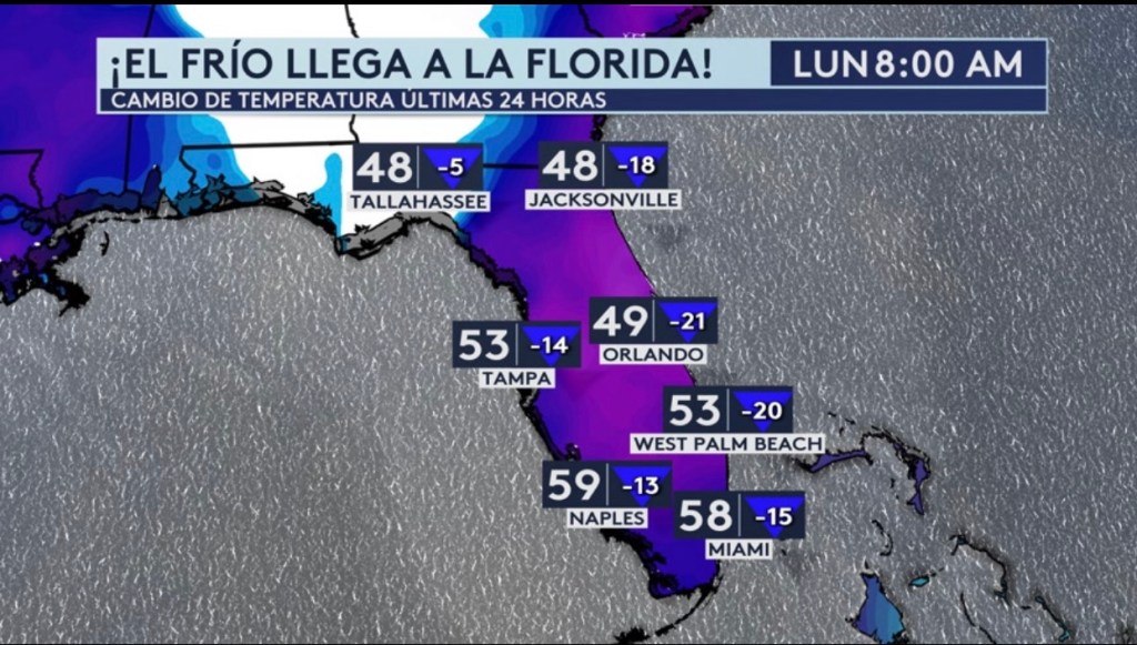 •Un amanecer más frío en Florida con temperaturas entre 10 y 20° más frías que hace 24 horas