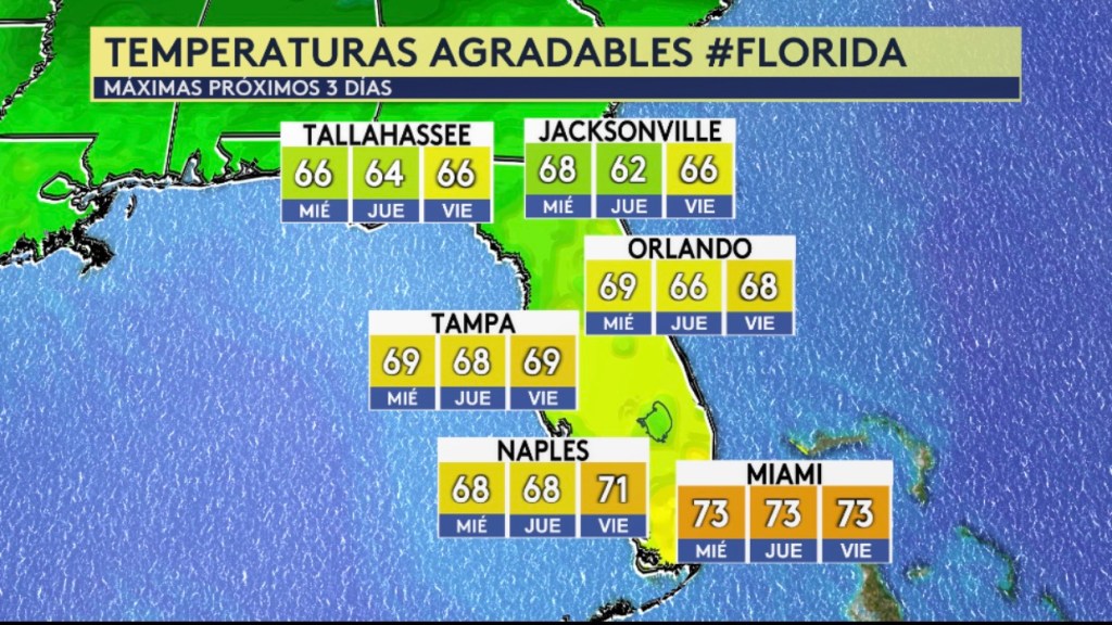 •Para los próximos días, podemos esperar temperaturas máximas agradables en el rango de los 60s para el norte y centro de Florida y en el rango de los 70s para el sur de la Florida.