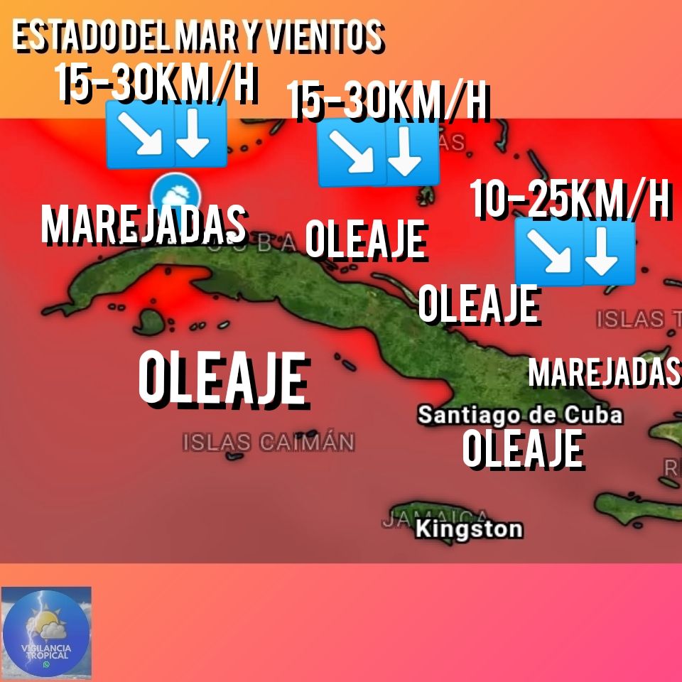 En la costa norte occidental habrá fuertes marejadas que disminuirán a marejadas en la tarde, en el litoral norte central habrá fuertes marejadas disminuyendo de forma gradual a oleaje en la tarde, en la costa norte oriental habrá marejadas que disminuirá a oleaje desde la tarde excepto en el litoral norte desde Cayo Moa a punta de Maisí donde se mantendrán las marejadas. En la costa sur oriental habrá marejadas donde disminuye desde la mañana a oleaje, en el resto del litoral sur habrá oleaje. Al sur del archipiélago de la Reina habrá marejadas disminuyendo a oleaje desde el final de la mañana.