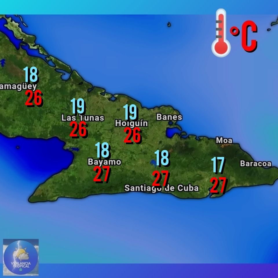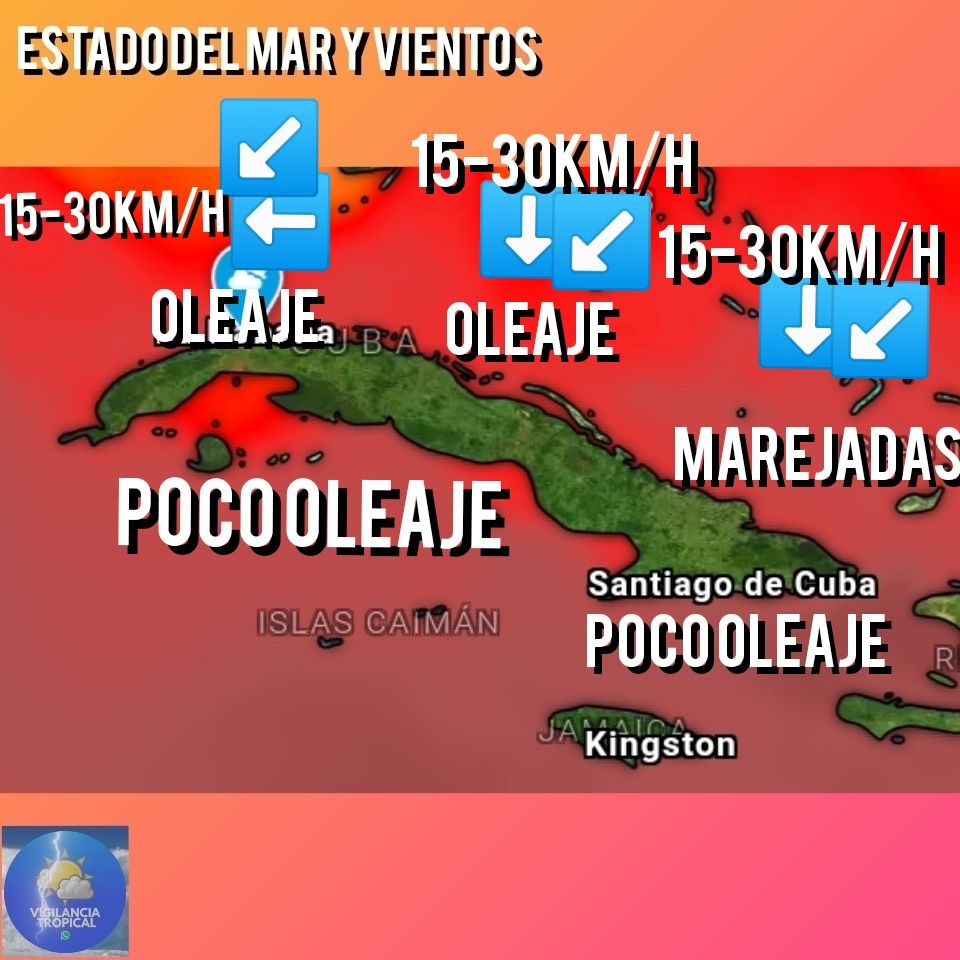 Los vientos serán del nordeste al este en occidente y del norte al nordeste en el resto del archipiélago, con velocidades entre 15 y 30 kilómetros por hora, con rachas superiores hacia zonas de la costa norte.