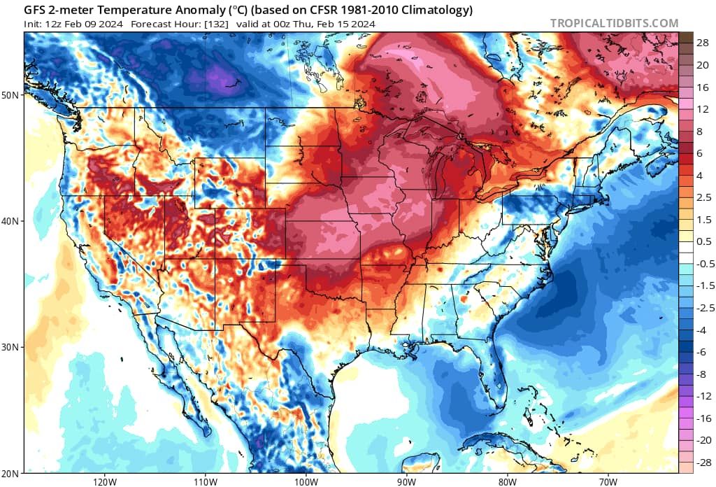 •Modelo GFS 12z válido para el 15 de febrero de 2024 / pronóstico de anomalías de temperaturas. (TropicalTidbits).