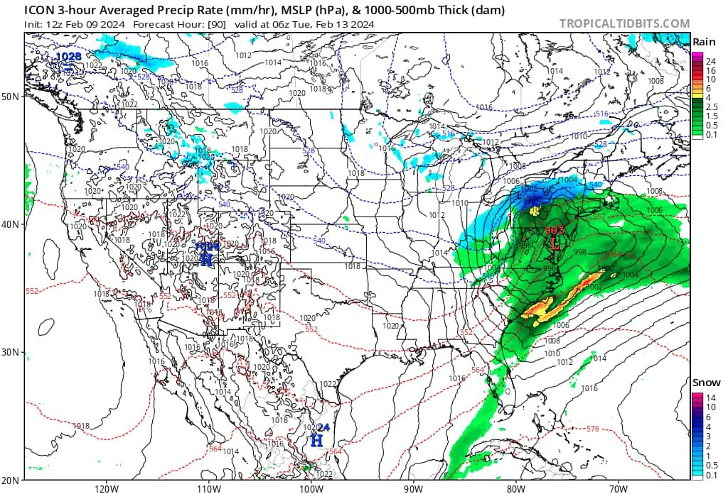 •Modelo ICON en su salida 12z de hoy viernes 9 de febrero válido para la mañana del martes 13 de febrero del 2024. (TropicalTidbits).
