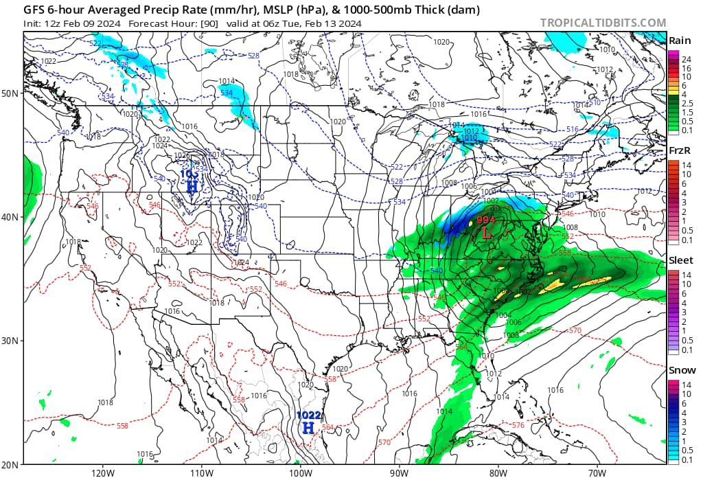 •Modelo GFS en su salida 12z de hoy viernes 9 de febrero válido para la mañana del martes 13 de febrero del 2024. (TropicalTidbits).