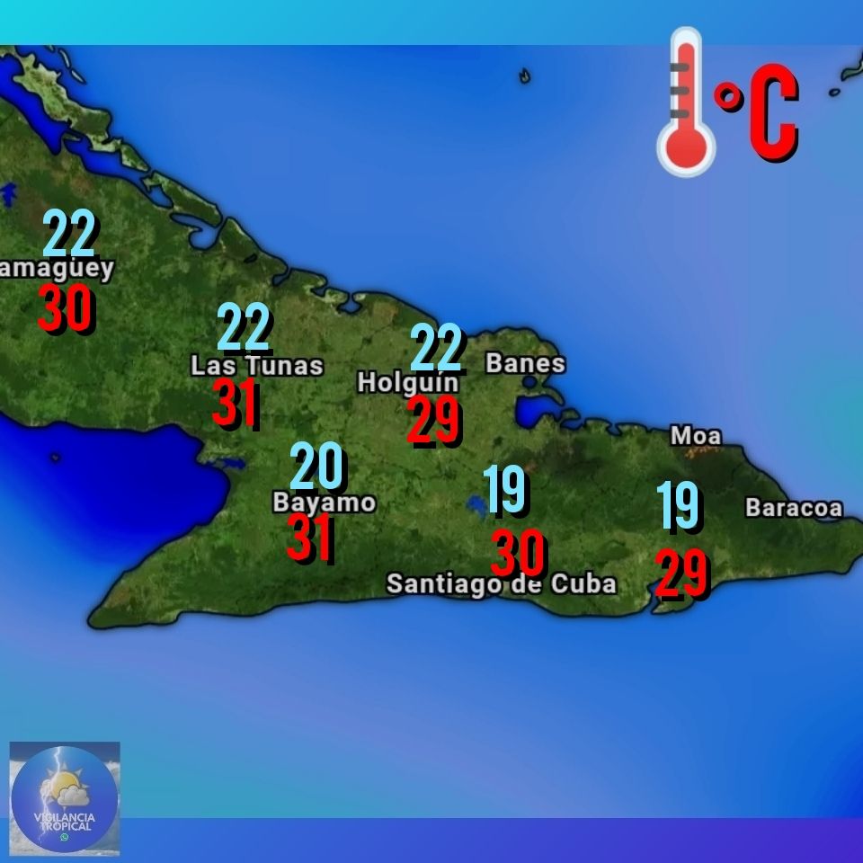 Las temperaturas máximas estarán entre 26 y 29 grados Celsius, superiores en algún punto del interior de la región oriental. En la noche las temperaturas estarán entre 19 y 22 grados Celsius, inferiores en algunas localidades del interior.