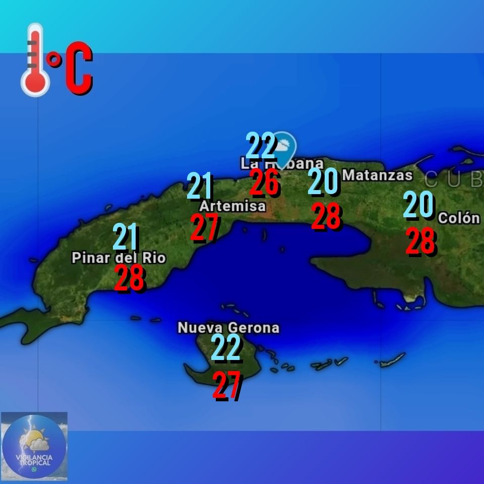 Las temperaturas máximas estarán entre 26 y 29 grados Celsius en occidente y zonas de la costa norte central, en el resto tendrán valores entre 29 y 32 grados Celsius, superiores en el sur oriental. En la noche las temperaturas descenderán a valores entre 18 y 21 grados Celsius en la mitad occidental, que serán inferiores en algunos puntos del interior y superiores en el resto del país, entre 20 y 23 grados Celsius.