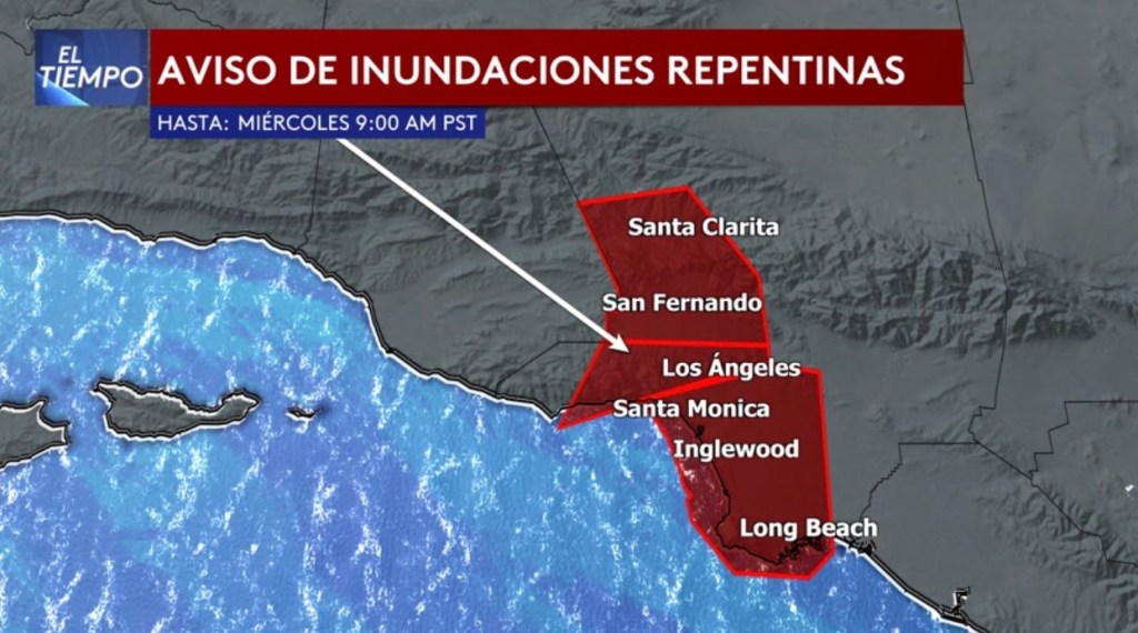 •Aviso de inundaciones repentinas para el sur de California que incluye ciudades como Los Ángeles, Santa Clarita, Santa Monica y Long Beach hasta las 9:00 AM en la hora de California