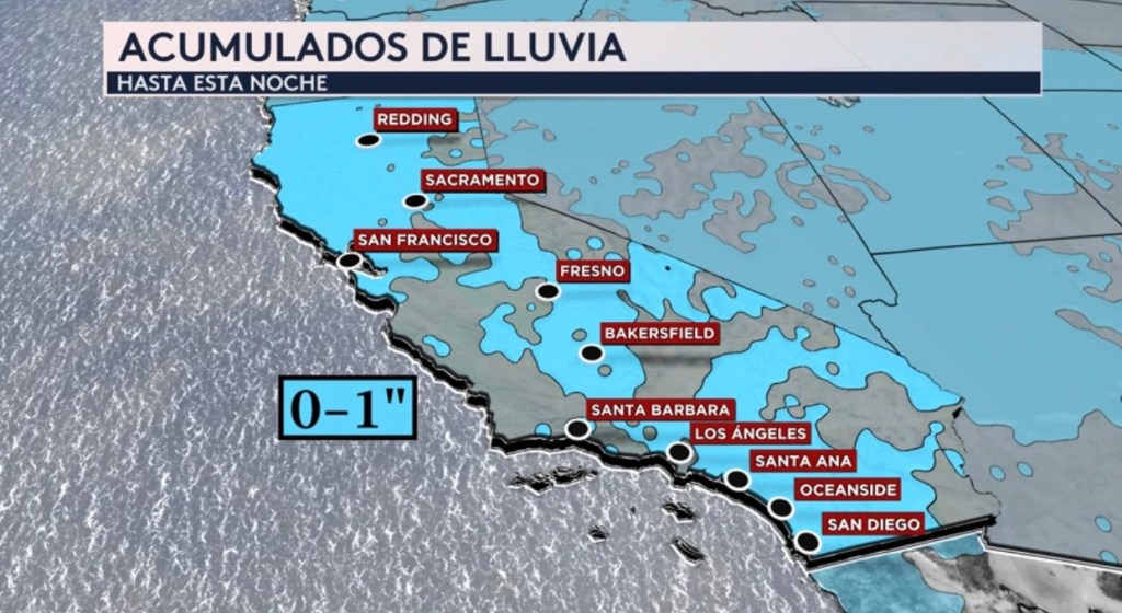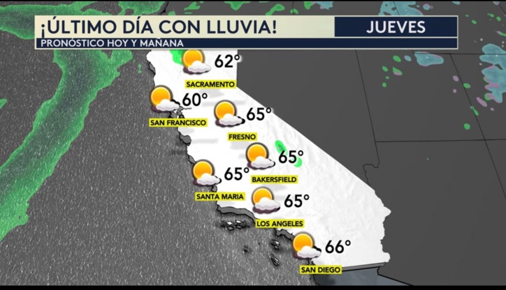 •Hoy será el último día con lluvias en California. La lluvia se disminuye esta noche para el sur de California y para el estado entero por la madrugada del jueves