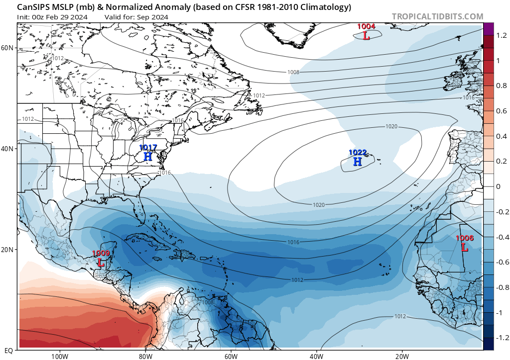 •En la noche de ayer jueves 29 de febrero el modelo CanSIPS / modelo especializado muestra combinación que no son alentadoras de cara a la venidera temporada ciclónica atlántico 2024