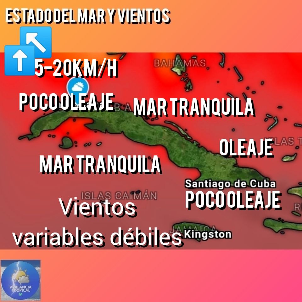 Habrá marejadas en la costa norte oriental, que disminuirá a oleaje desde el final de la mañana. En el norte de occidente y desde cabo Cruz hasta punta de Maisí habrá poco oleaje, mientras en el resto de las costas la mar estará tranquila.
