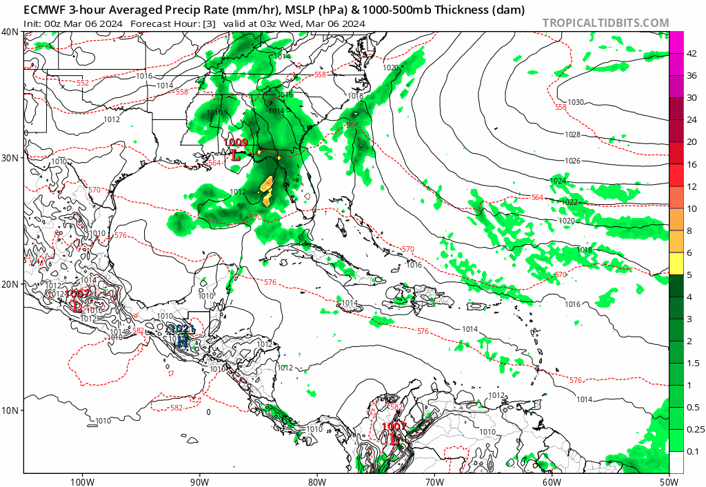 Buenos días, comenzamos echando un vistazo al más resiente análisis de superficie realizado por la NOAA(Fig.1), y los pronósticos de precipitaciones para el resto del día de los principales modelos (Fig.2) y (Fig.3). Comenzamos como de costumbre mirando que tiene el mapa de superficie en nuestra región, nos damos cuenta que lo más interesante es que el Sudeste de los Estados Unidos está siendo afectado por una amplia pero débil zona de bajas presiones extratropical, dejando condiciones de tiempo severo en algunos puntos y zonas fuertes de precipitación. Sin embargo para Cuba las condiciones del tiempo varían muy poco, permanecemos bajo la influencia de las Altas presiones con su centro retirado en el Atlántico Norte quedando nuestro país en su dorsal más externa, por lo que seguimos bajo un débil gradiente que genera ese flujo del Sudeste, provocando que sigamos con temperaturas cálidas y con la probabilidad de que se nuble en zonas del interior a lo largo de todo el archipiélago con aisladas lluvias en horas de la tarde, esto también es favorecido precisamente por el fuerte calentamiento vespertino y condiciones locales, no se descarta tampoco la posibilidad de alguna tormenta eléctrica, igualmente de manera aislada. En algunos puntos estos chubascos pueden extenderse hasta las primeras horas de la noche.
