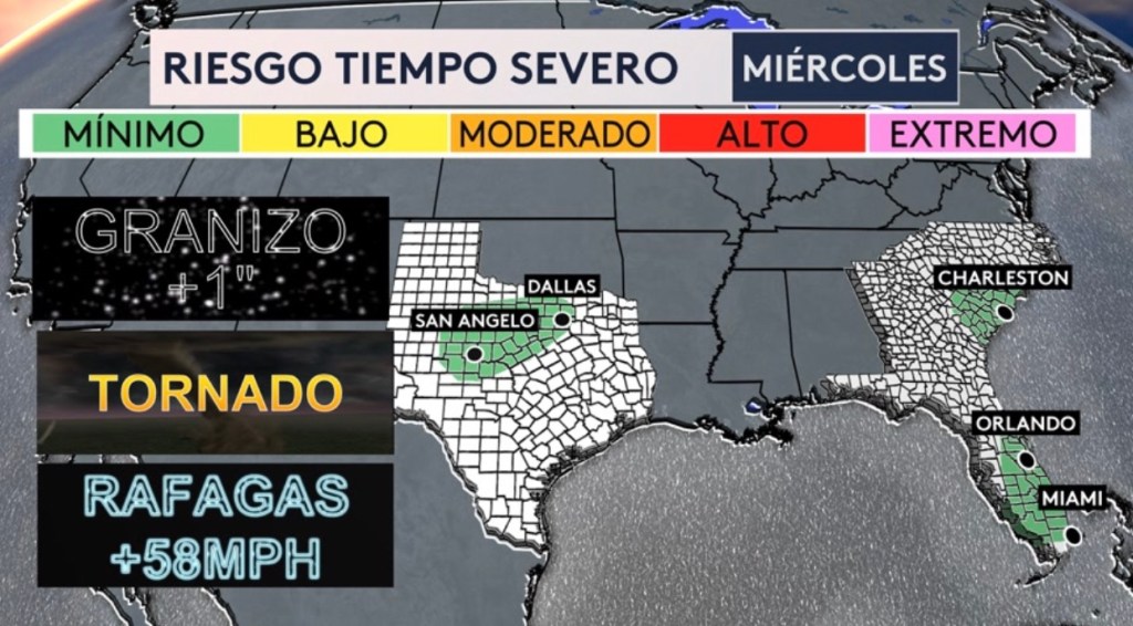 •Riesgo de tiempo severo hoy para 3 regiones: Florida, Texas y las Carolinas.