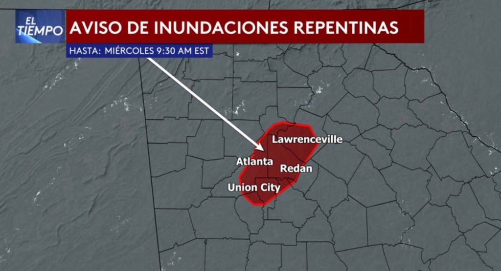 •Aviso de inundaciones repentinas esta mañana en Georgia para ciudades como Atlanta hasta las 9:30 AM