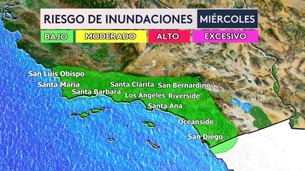 •También habrá un riesgo de inundaciones para el sur de California para ciudades como Los Angeles, San Diego, Santa Ana, Santa Barbara, Santa María y Santa Clarita