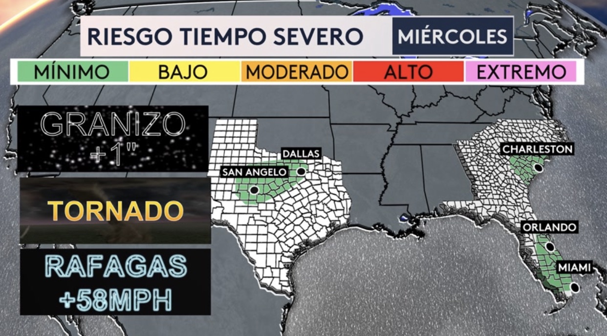 •Riesgo de tiempo severo hoy para 3 regiones: Florida, Texas y las Carolinas.