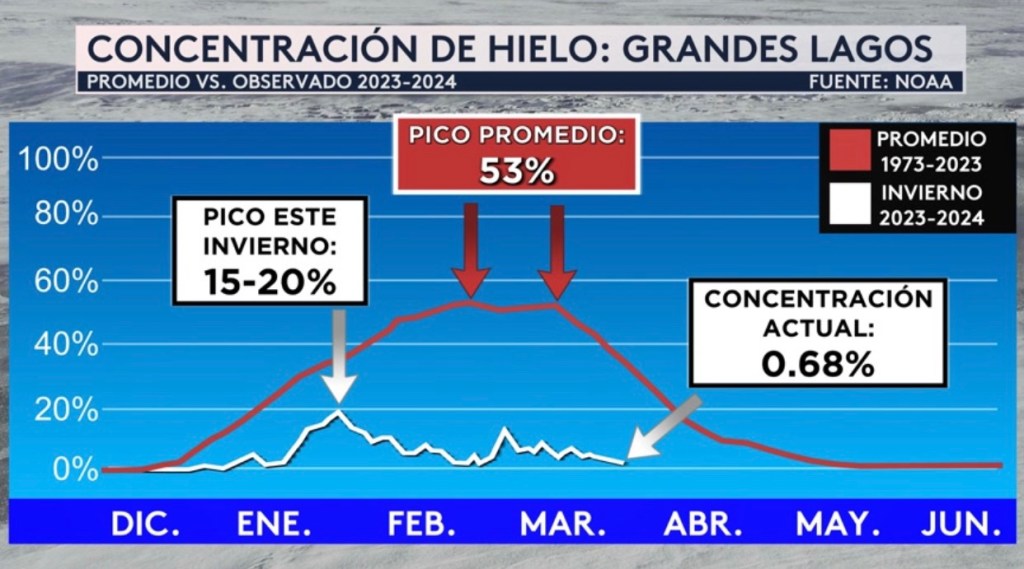 •Concentración de hielo sobre los Grandes Lagos este invierno (línea blanca) frente al promedio de 40 años (línea roja). La cobertura máxima de hielo (≈53%) se debe observar en esta época del año, pero ayer estamos prácticamente sin hielo (0,68%). El pico de este invierno fue del 15 al 20%, menos de la mitad del pico promedio.