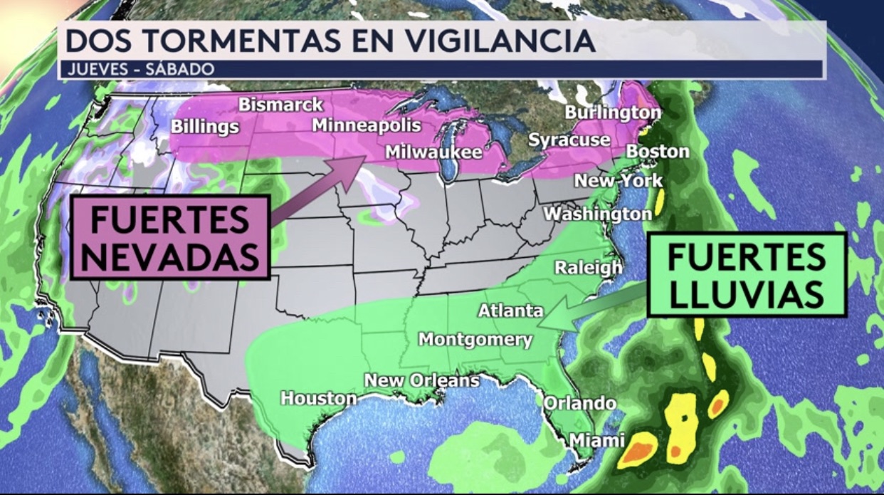 •Dos tormentas en vigilancia entre el jueves y el sábado, una que traerá fuertes nevadas para el norte del país mientras que la otra traiga fuertes lluvias al sur y este