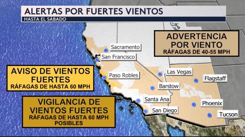 •El mismo sistema de baja presión que traerá todo esta precipitación también producirá condiciones ventosas para California, Nevada y Arizona hoy y mañana.
