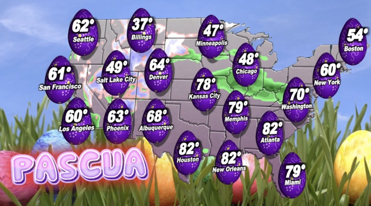 •Pronóstico nacional para pascua este domingo: lluvia para el medio oeste (Chicago, St. Louis), para el sur de California (Los Angeles, San Diego), y el oeste del país (Salt Lake City, Phoenix)