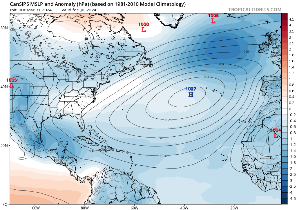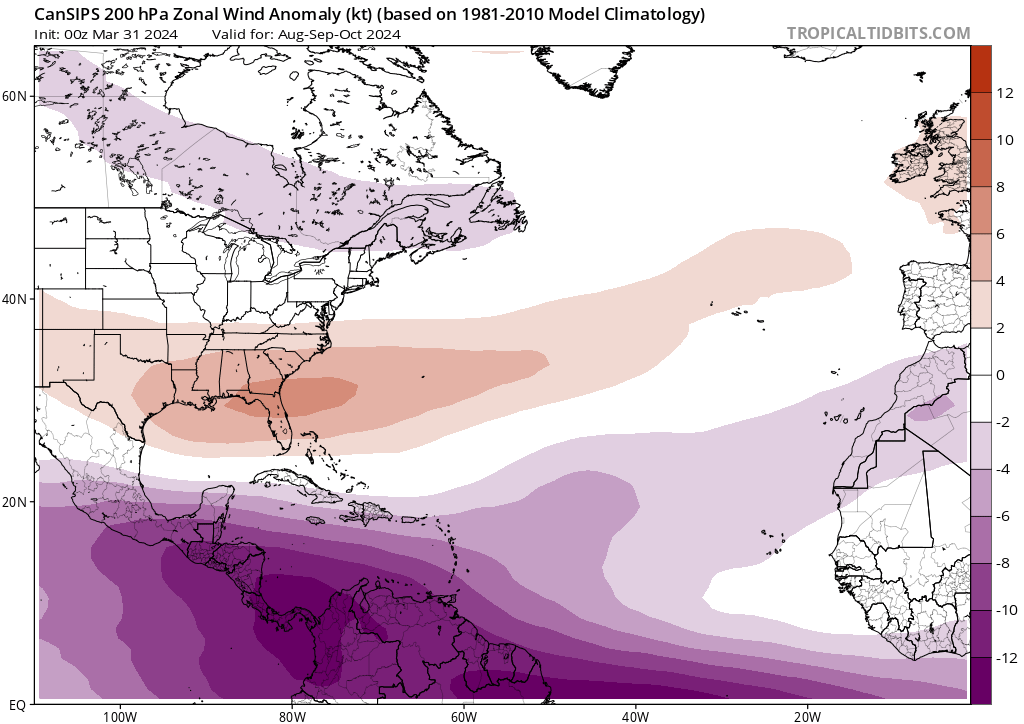 •El modelo CanSIPS indica baja cizalladura de viento (vientos cortantes) en gran parte del Atlántico tropical y el Caribe, siendo un factor muy importante a favor de la actividad ciclónica. CanSIPS indica que las temperaturas oceánicas en el Pacifico este estarían más frías de lo usual, concentrando la mayor actividad ciclónica en el Atlántico tropical y el Caribe.