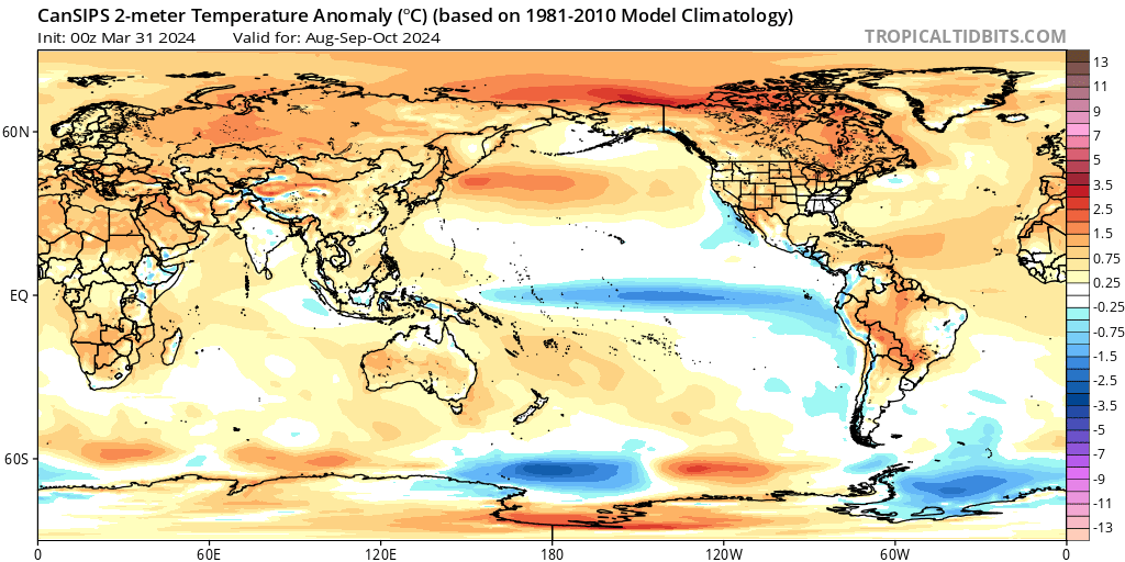 •Pronóstico del ENSO/ modelo CanSIPS para el corazón de la temporada de huracanes 2024 (Agosto – Septiembre – Octubre).