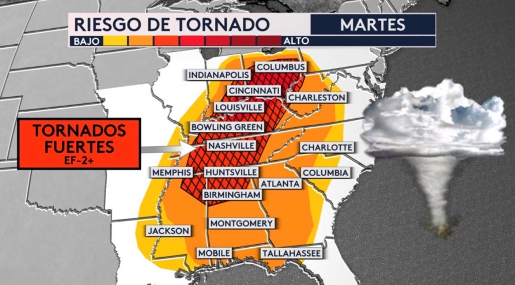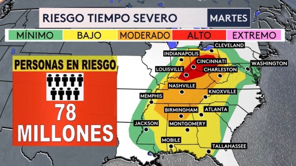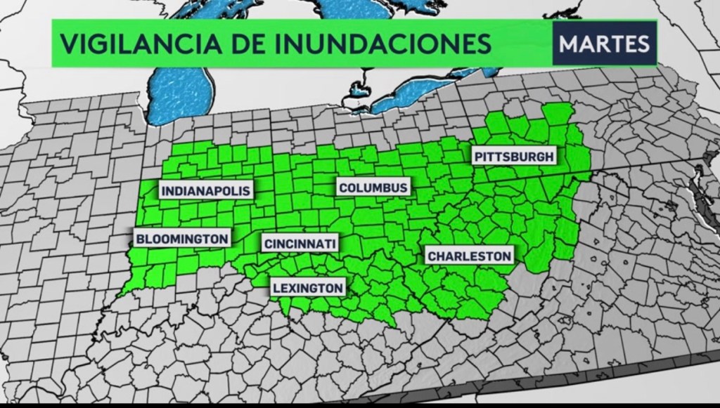 •Otra vez habrá el riesgo de tiempo severo hoy con el riesgo más alto para Kentucky, Indiana y Ohio. Tornados fuertes, granizo de gran tamaño y vientos dañinos todos son posibles