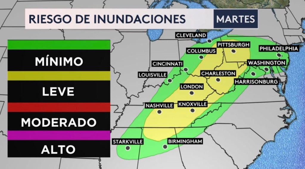 •Riesgo de inundaciones hoy para los Valles de Tennessee y Ohio, los Apalaches y la región del Medio Atlántico