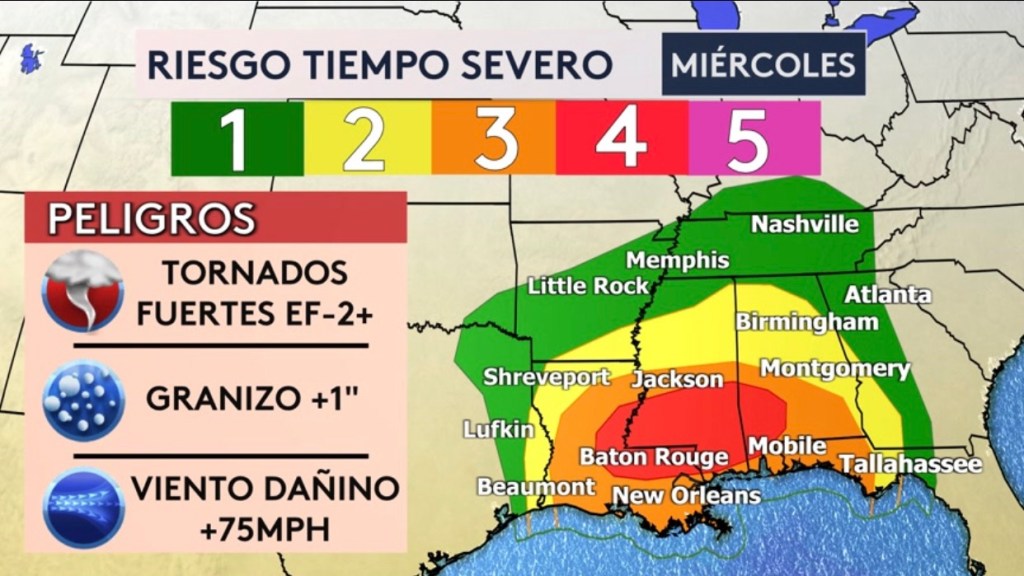 •Riesgo de tiempo severo desde el sur del país hasta el Valle de Tennessee. El riesgo más alto está en la sombra roja que incluye ciudades como Baton Rouge en Louisiana y Hattiesburg en Mississippi. Los riesgos van a ser tornados fuertes, granizo y vientos dañinos a significativos