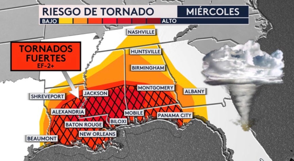 •Riesgo de tornados hoy con el riesgo más alto para tornados fuertes (EF-2+) desde Louisiana hasta el panhandle de la Florida
