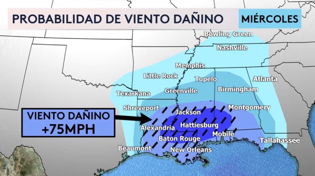•También hay la posibilidad de vientos dañinos para el sur del país hasta el Valle de Tennessee y de vientos significativos (75 mph+) desde Louisiana hasta Alabama/extremo oeste del panhandle de la Florida
