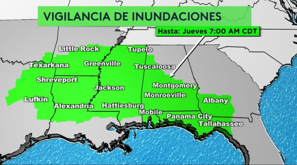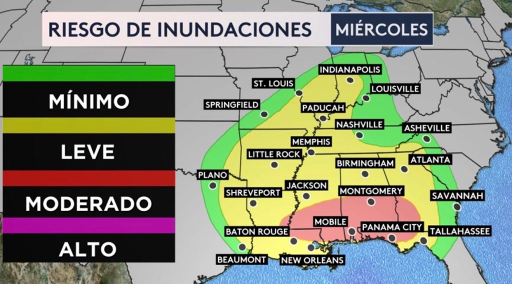 •Riesgo de inundaciones hoy se expande desde el sur y sureste del país hacia el norte hasta el Valle de Ohio. El riesgo más alto es en la sombra roja y para ciudades como Panama City y Pensacola en la Florida; Mobile y Montgomery en Alabama; Hattiesburg y Gulfport en Mississippi