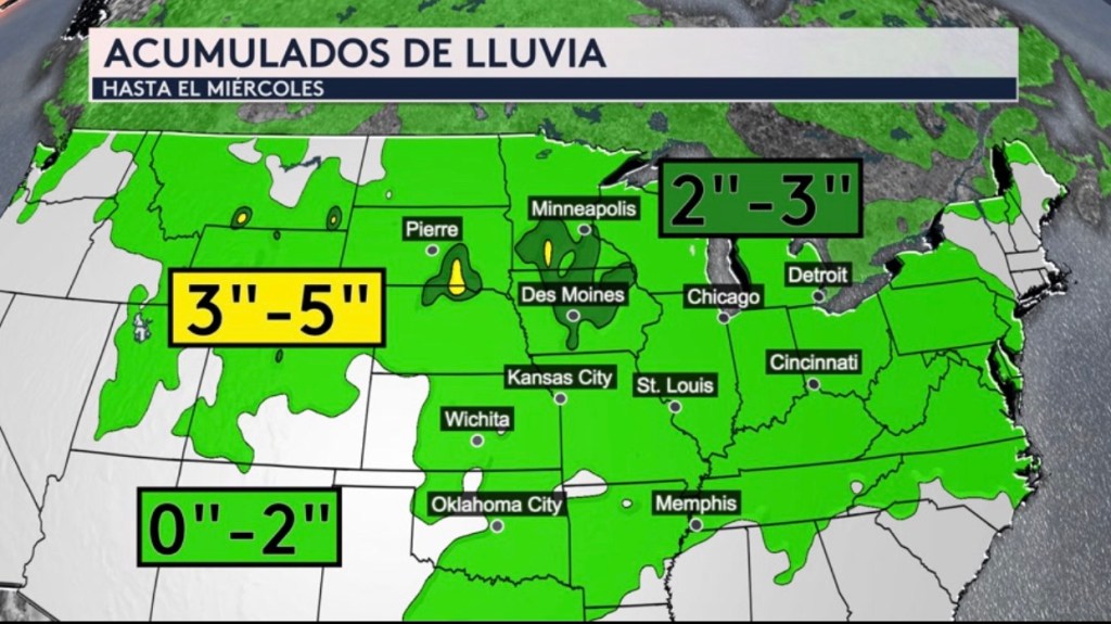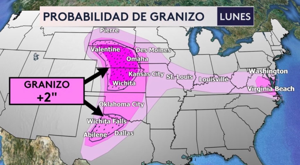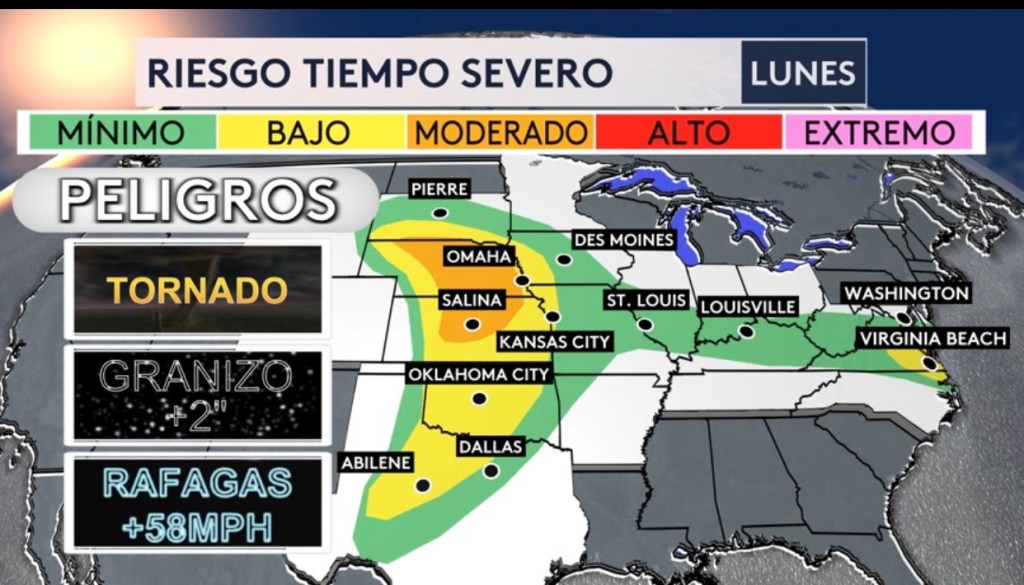 •Riesgo de tiempo severo desde Texas hasta Dakota del Sur y hacia el este hasta el Medio Atlántico. La amenaza principal será granizo de más de 2” en diámetro (tamaño de un limón/huevo)