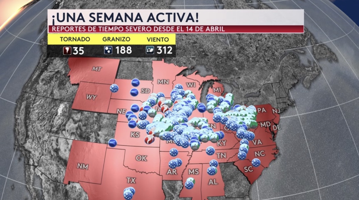 •¡Ha sido una semana activa con 535 reportes de tiempo severo preliminares desde el domingo pasado (14 de abril). Se reportó tiempo severo desde Montana a Nuevo México y hasta New Jersey