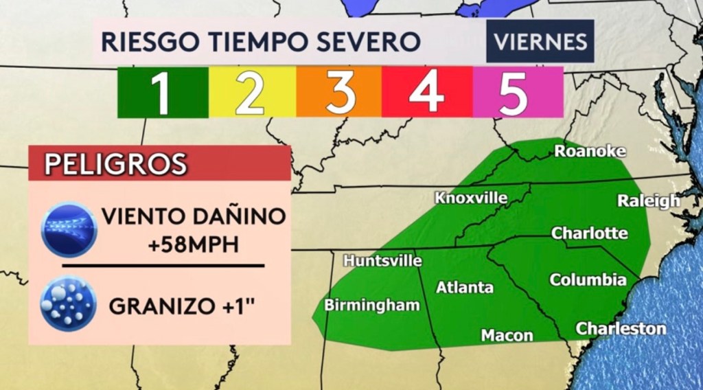 •Riesgo de tiempo severo hoy desde Mississippi hasta Virginia del Oeste y para el sur-centro de Texas mañana. Aunque estos riesgos son más bajos en comparación con días anteriores, granizo y vientos dañinos todavía son posibles