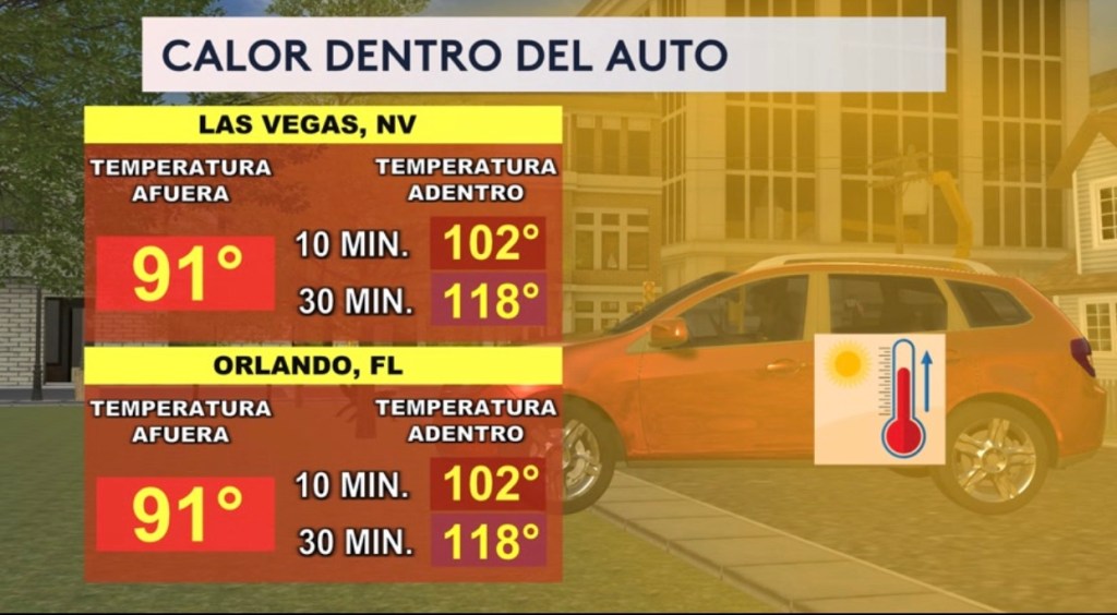 •Es muy importante saber que un auto se puede convertir en un horno en cuestión de minutos. Se espera una temperatura máxima de 91° en Las Vegas y Orlando hoy. ¡La temperatura del interior del auto puede llegar a los 118° en solamente 30 minutos!