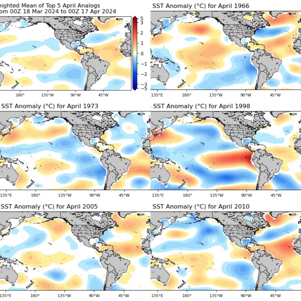 Los 5 análogos basados en las anomalías de la temperatura de la superficie del mar durante el mes pasado (18 de marzo-17 de abril de 2024) son 1966, 1973, 1998, 2005 y 2010; todas ellas fueron temporadas por encima de la media a hiperactivas excepto 1973. Estos análogos se encuentran en la imagen inferior.