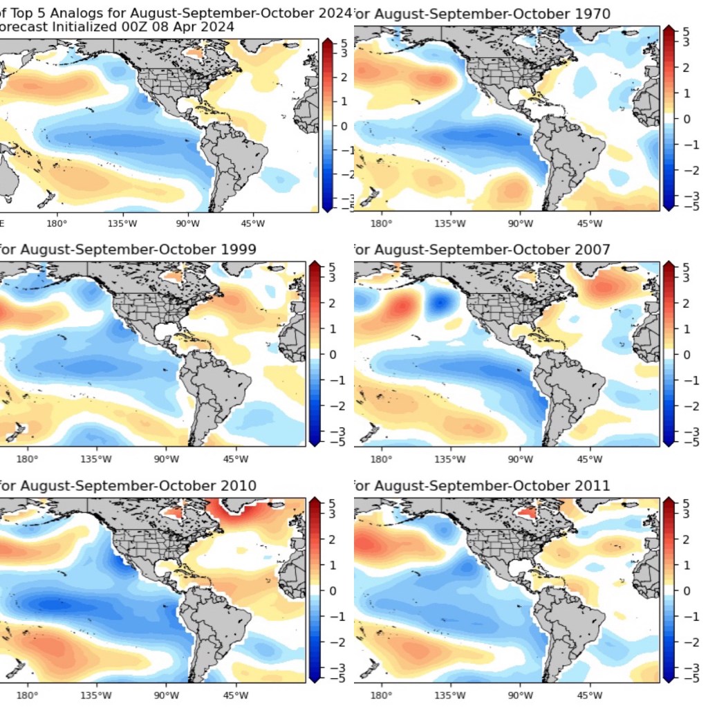 En la previsión anterior, se analizó la climatología de La Niña y se utilizó posteriormente para calcular predicciones numéricas para la próxima temporada de huracanes en el Atlántico en 2024. También se incorporaron a la previsión los resultados producidos por nuestros modelos climáticos. En esta previsión, también implementaremos dos nuevos análisis: 10 análogos basados en la temperatura de la superficie del mar, 5 que reflejan las observaciones mensuales actuales (abril) y 5 que reflejan la previsión de agosto-septiembre-octubre. Estos análogos se derivan de la similitud entre las temporadas de huracanes pasadas y las proyecciones de la temporada 2024 basadas únicamente en las anomalías de la temperatura de la superficie del mar sobre el Atlántico Norte.