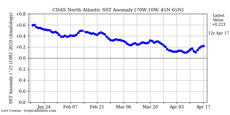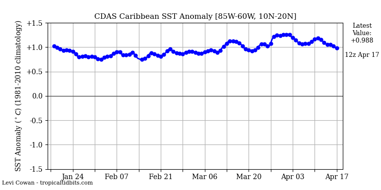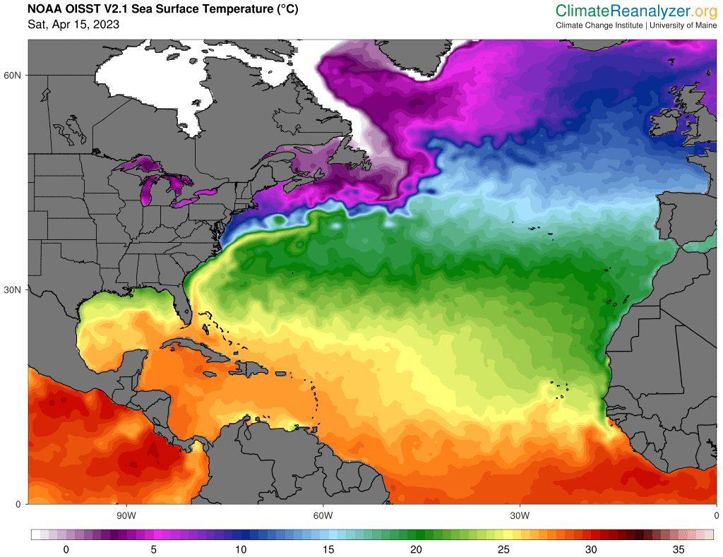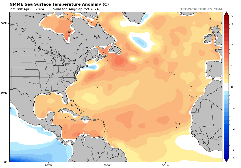 La anomalía actual de la temperatura de la superficie del mar para el Atlántico Norte es de +0,208°C, basada en una media de 30 años (1981-2010). Desglosando por regiones, el Atlántico MDR (región principal de desarrollo/atlántico tropical) tiene una anomalía de +0,811°C, +1,022°C para el mar Caribe, +0,273°C para el golfo de México y +0,326°C sobre los subtrópicos.